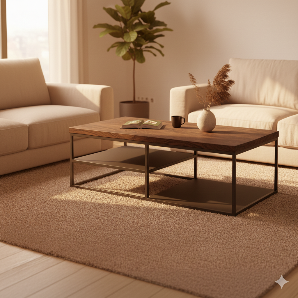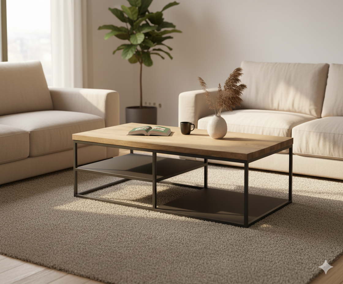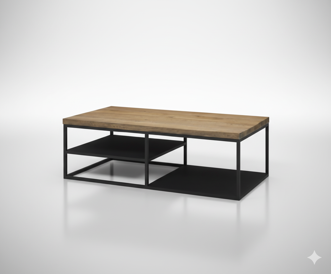 Stijlvolle salontafel met een massief eiken blad en strak zwart stalen frame. Verkrijgbaar in twee warme houttinten – Dessert en Bassano – voor een perfect evenwicht tussen industrieel design en natuurlijke elegantie.
