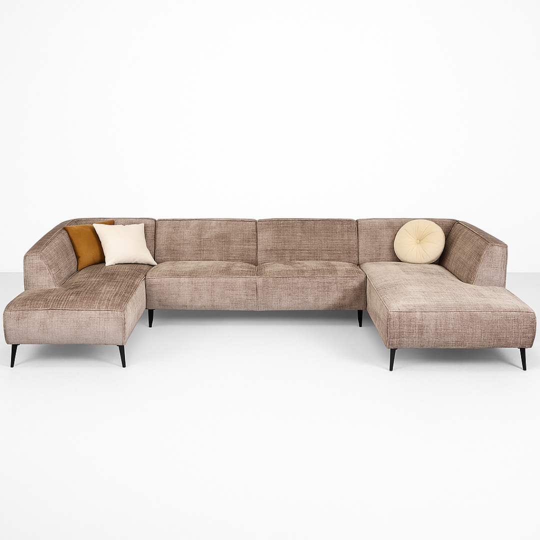 De Stiloo-bank is een verfijnde keuze voor wie comfort en design waardeert. Met een royaal formaat van 210 × 270 × 77 cm, een ottomaan links, een centrale 2-zits en een chaise longue rechts (ook in spiegelbeeld leverbaar), biedt deze bank een perfecte balans tussen ruimte en stijl.